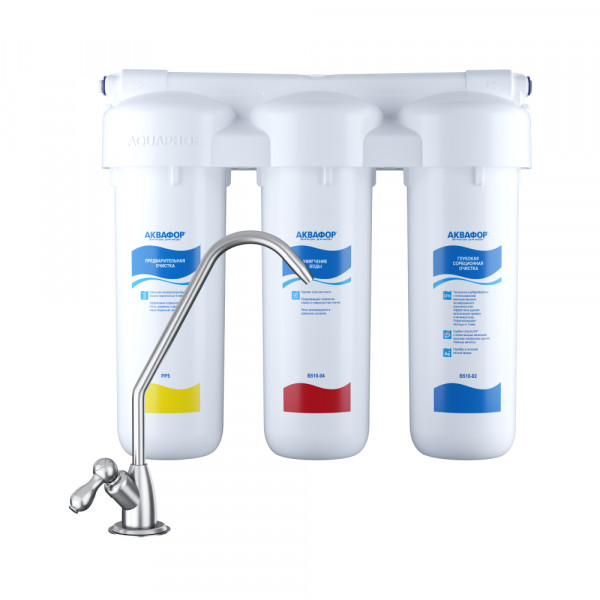 Обратноосмотические фильтры используются для абсолютной защиты от накипи, т.к. полностью устраняют соли жесткости из воды.нетЧисло ступеней очисткиКартриджи последовательно очищают воду и от видимых примесей, и от растворенных. Первый картридж задерживает более крупные частицы, а каждый последующий - более мелкие. Чем больше ступеней - тем лучше фильтр очистит воду: поймает более мелкие видимые частицы ржавчины, песка и ила, успеет захватить из воды максимум растворенных примесей - хлора, нитратов, тяжелых металлов и других.3МинерализацияПроисходит после финишной очистки воды. Необходима прежде всего в фильтре обратного осмоса, поскольку такой фильтр полностью устраняет из воды все примеси, в том числе минералы. Минералы добавляются в оптимальной концентрации - для пользы и привычного вкуса воды.нетПостфильтрацияФинальный этап очистки воды: картриджи постфильтрации удаляют самые мелкие механические частицы и кондиционируют воду, придавая ей более приятный вкус.нетНакопительная емкостьОбычно нужна в фильтрах обратного осмоса. Глубокая фильтрация требует времени. Чтобы Вам не приходилось ждать, пока вода наберется в чайник или кастрюлю, почти во всех моделях используется накопительный бак для чистой воды или другая емкость. В стандартном фильтре обратного осмоса под мойку воды в баке достаточно для семьи из 5-6 человек.нетФильтрующий модуль в комплектедаОтдельный крандаДавление в водопроводе не более, атмМаксимальное давление воды на входе в систему, при котором возможна стабильная работа фильтра.6,5Ширина, смОбратите внимание на габариты фильтра, и измерьте, сколько свободного пространства в предполагаемом месте установки.33,2Глубина, смОбратите внимание на габариты фильтра, и измерьте, сколько свободного пространства в предполагаемом месте установки.10,5Защита корпуса от гидроударовдаИсходная водаЖесткая вода – вода с избытком минеральных солей. От нее появляется накипь в чайнике, известковый налет на сантехнике и разводы на посуде. Мягкая вода – та, в которой мало минеральных солей. Нет накипи в чайнике и разводов на посуде. Фильтры для мутной воды и фильтры от ржавчины, как правило, имеют несколько стадий очистки и дополнительный полипропиленовый картридж. Он задерживает механические частицы ила, песка и ржавчины и защищает картриджи более глубокой очистки.жёсткаяУстраняет мутностьМутность водопроводной воды может говорить о том, что в ней много мелких механических частиц. Важно, чтобы в фильтре был установлен дополнительные картридж механической предфильтрации (полипропиленовый) - он продлит жизнь остальным картриджам более тонкой очистки.даУстраняет ржавчину, бурый осадокЛюбой фильтр под мойку удалит из воды крупные и мелкие частицы ржавчины. Некоторые фильтры имеют повышенный ресурс по железу: они дольше служат в такой воде, поскольку лучше подходят для удаления из воды железа и механических частиц ржавчины.нетЗащита от бактерийВсе проточные фильтры в той или иной степени защищают от бактерий. Например, добавление серебра препятствует их размножению. Это стандартная степень защиты. Если в семье есть дети, пожилые люди или аллергики, воду рекомендуется обеззараживать, то есть полностью удалять микроорганизмы. Повышенную защиту от бактерий дают фильтры с половолоконной мембраной. Это пучок тру